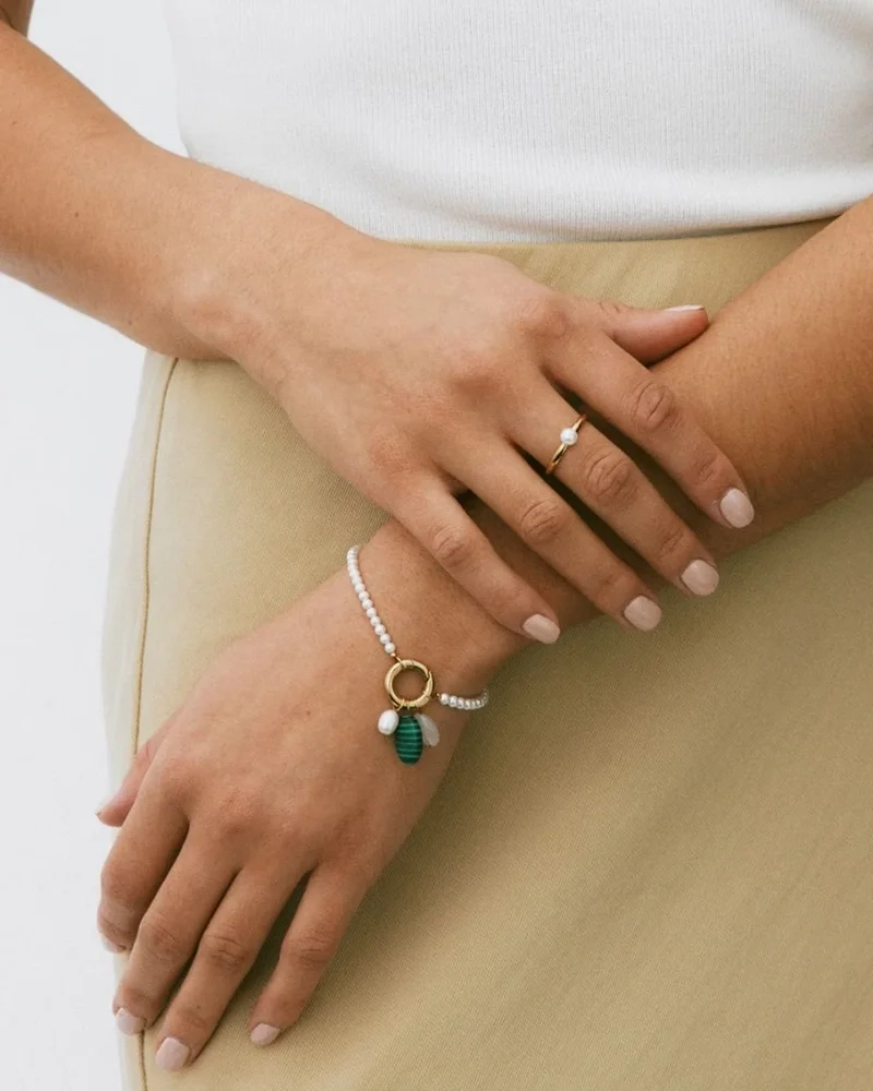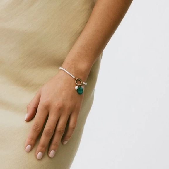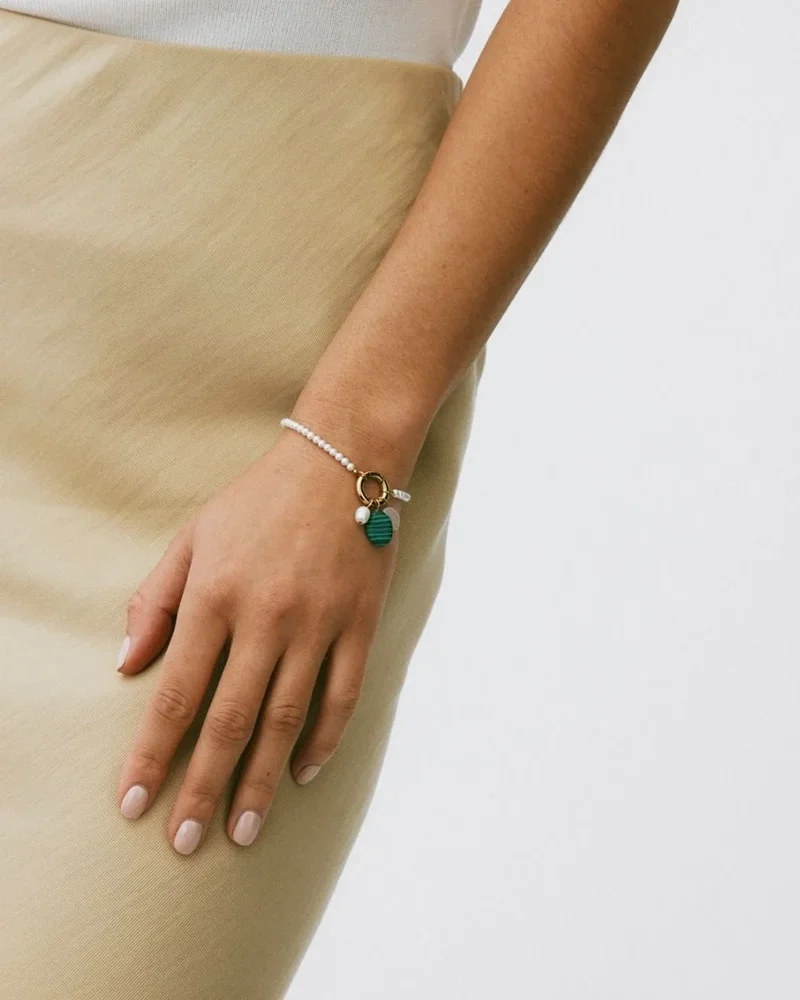 Upptäck elegansen i Edblads Beach Chrystal Bracelet, perfekt för en sofistikerad semesterstil. Detta färgglada smycke pryds av en rad sötvattenpärlor och tre unika hängen: en sötvattenpärla, en mjukt rundad rosenkvarts och en grön malakit. Dessa noggrant utvalda element skapar en harmonisk och stilfull kombination som förhöjer din personliga stil. Låt detta armband bli en del av din smyckessamling och ge din semester en känsla av lyx och färg.