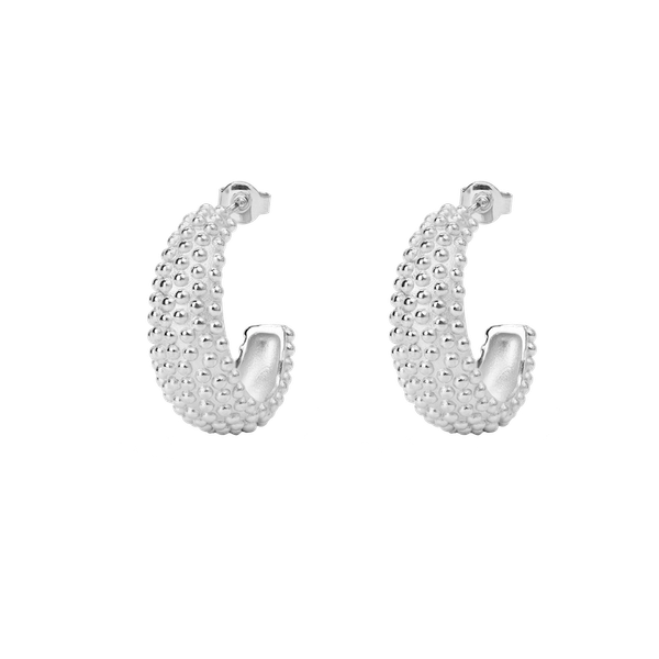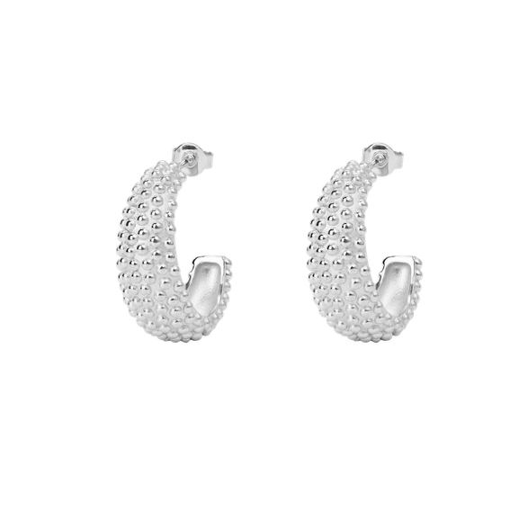 Snygga creoler med en design inspirerad av morgondagg. Framsidan på örhängena är klädd med små silverpärlor med en matt finish. De är bekväma att bära och passar att komplettera din vardagsklädsel.