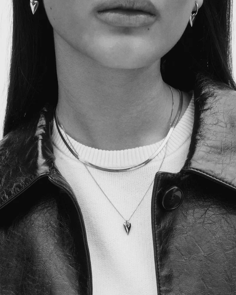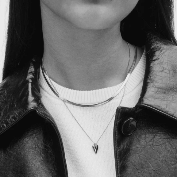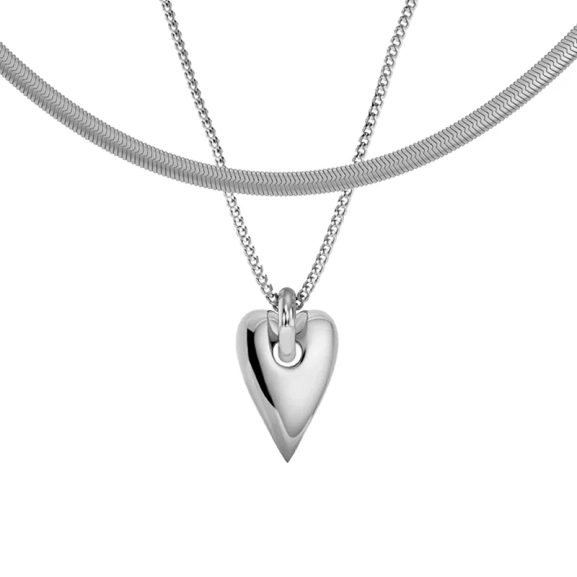 Ett elegant set som kombinerar tidlös elegans med trendig lager-på-lager-design. Den mjukt glänsande herringbone-kedjan matchas med ett tunnare halsband prytt med den en hjärtberlock. Perfekt att bära ihop för en komplett stil eller separat för mer variation.