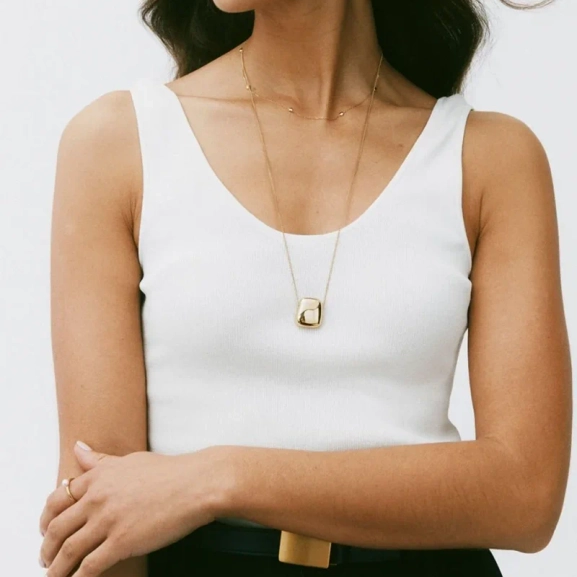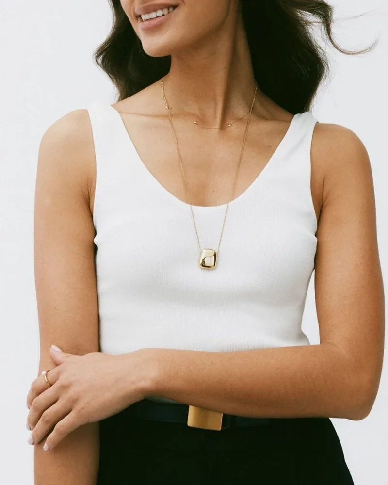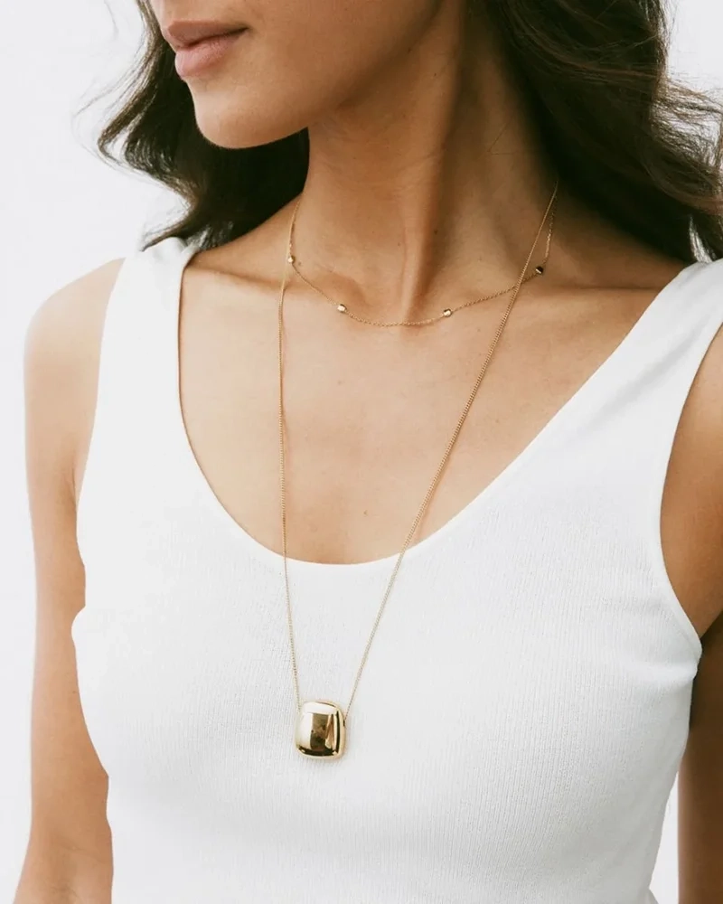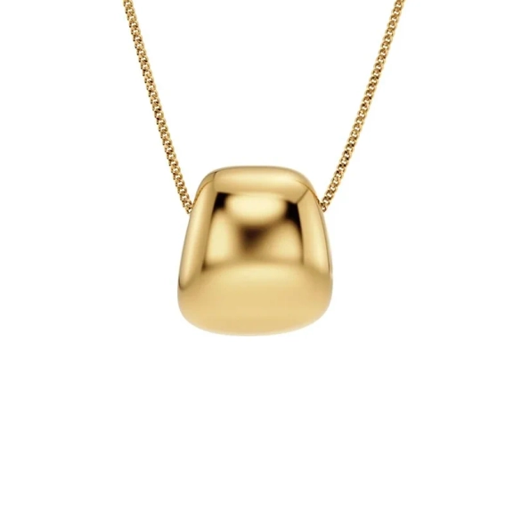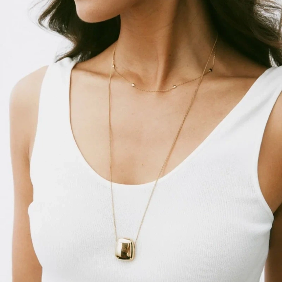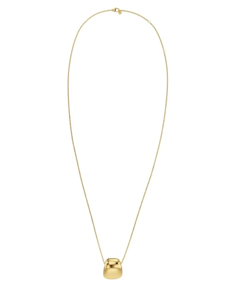 Mira, där mjuka och hårda element förenas i en harmonisk design. Det långa halsbandet, förgyllt med 14K guld, bär en imponerande välvd form som hänger från en robust pansarkedja. Denna unika skapelse ger din stil en sofistikerad och modern känsla, perfekt för att framhäva din personliga stil. Låt detta smycke bli en del av din vardag och ge varje tillfälle en extra gnista av elegans.