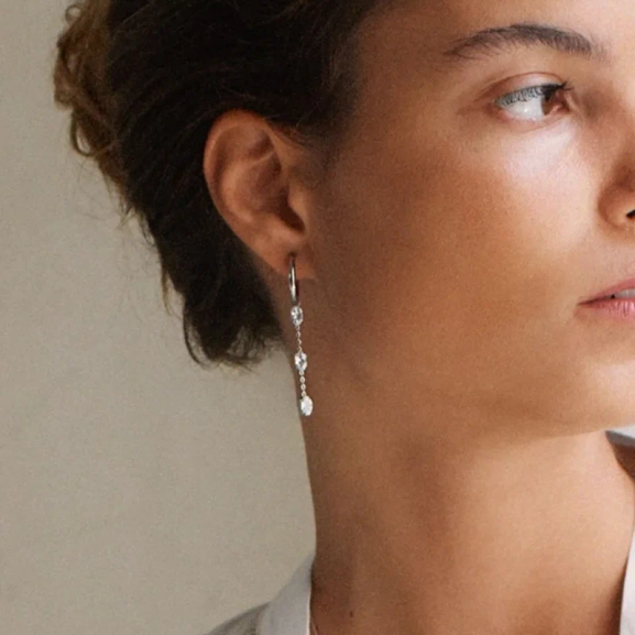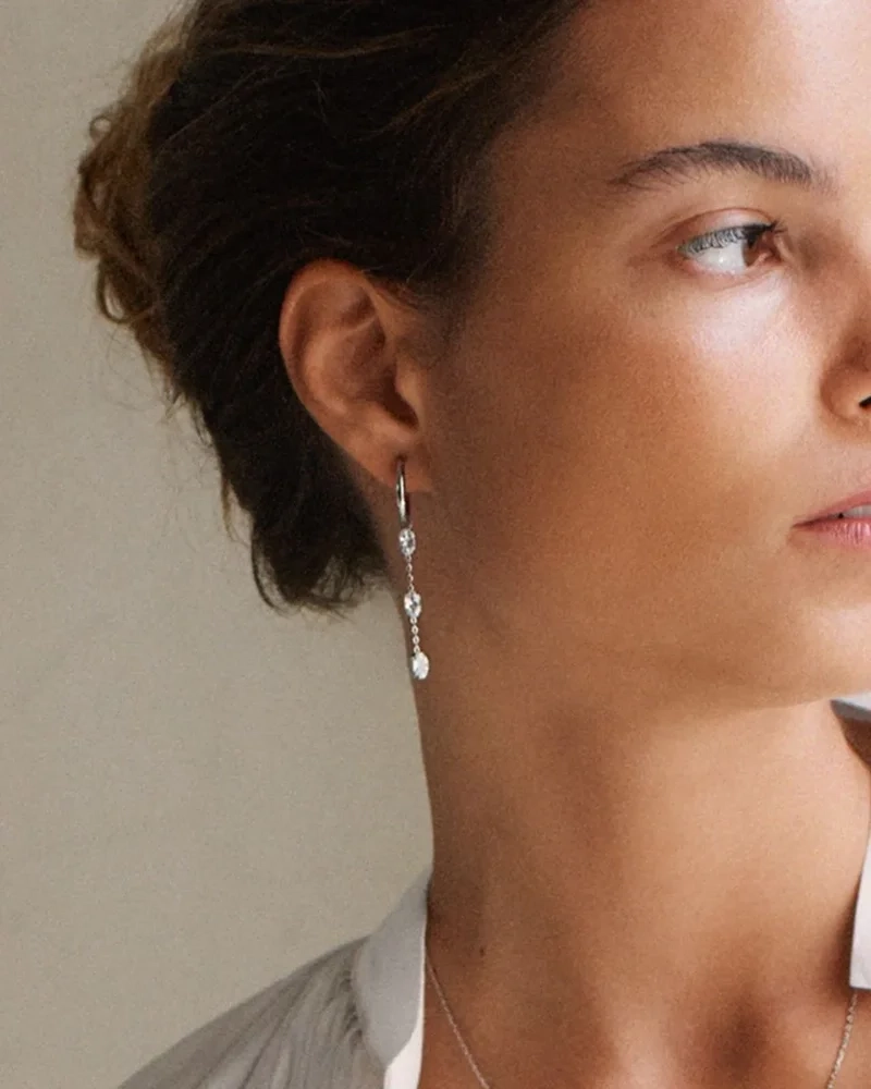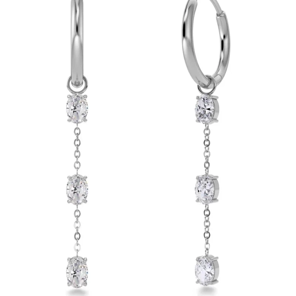 Gnistrande Misty erbjuder en uppfriskande upplevelse med små explosioner av glittrande stenar. Denna smyckeskollektion är perfekt för sommarens alla festligheter, och sträcker sig från festliga smycken till en diskret lyx i tre olika färgkombinationer. Perfekt för bröllopsgästen som vill stråla med måtta. Dessa eleganta hoops har en smal design med tre ovala, klara stenar infattade i polerat rostfritt stål, hängande på en fin pansarkedja på en noggrant utformad båge. Kombinera gärna med andra delar från kollektionen för att skapa en unik stil.