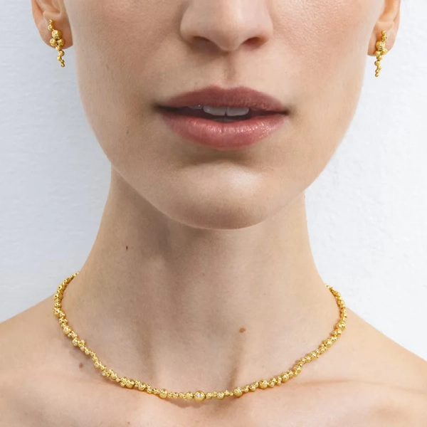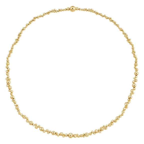 Ett vackert och mycket elegant halsband som är sammansatt av små guldpärlor i ett asymmetrisk design. Halsbandet är tillverkat i 18K guld och klätt med briljantslipade diamanter.