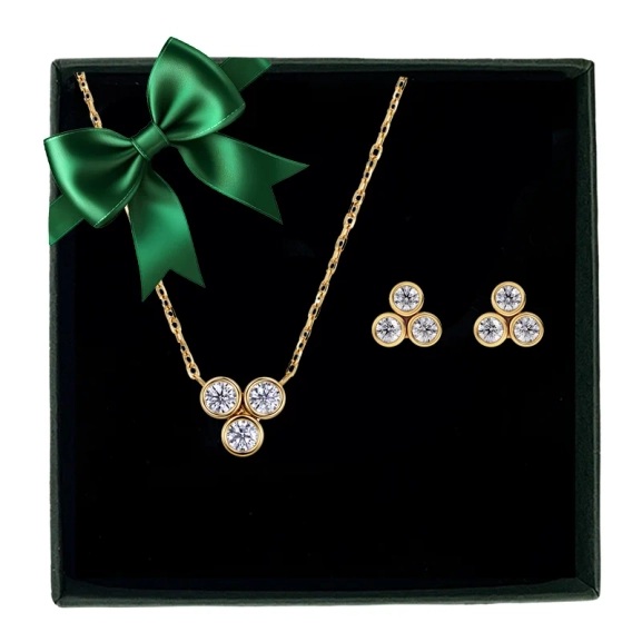 Elegant presentset från Edblads Barre-kollektion i 14K guldpläterat stål med gnistrande Cubic Zirconia. Halsbandet och örhängena har den ikoniska trippeldesignen som reflekterar ljuset vackert. En tidlös gåva som passar både vardag och fest.
